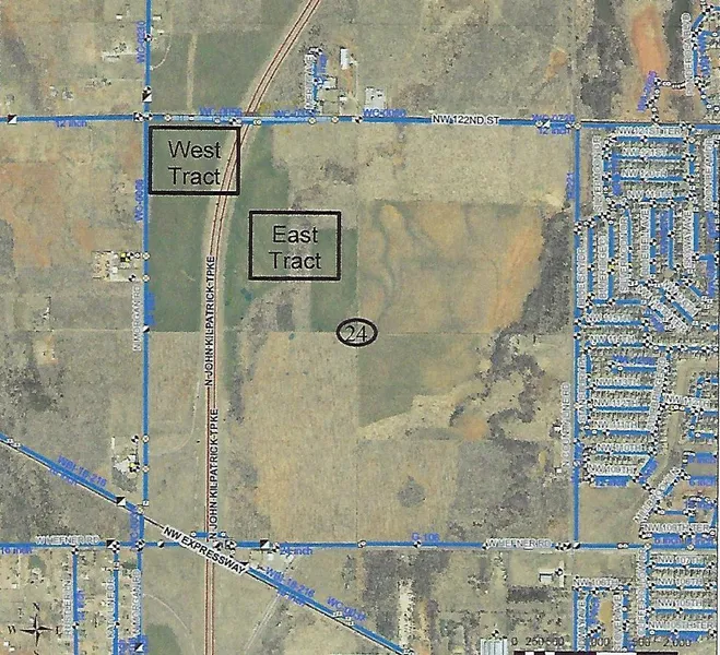 Part of a larger parcel that the Kilpatrick Turnpike split. Currently land is in pasture & crop, and NOT under lease. Highest and Best Use is for Re-Zone split/mix of Commercial and Residential development. Oklahoma City 12" water line on 122nd, OG&E electric and ONG gas are at road closes city sewer is 1/2 mile away on N. County Line Rd. ALTA Survey will be available soon for your buyers review, and abstracting is up to date and ready for immediate closing.
