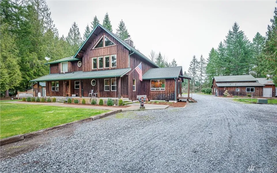 Stunning 6.3 acre estate provides the space and privacy one can only dream of.The panoramic view is absolutely breath-taking.The main home features 2550 sq ft, 3 bdrms, 2 ba + den with an open concept and expansive windows that frame the extraordinary view of Mt. Rainier. The 1588 sq ft detached ADU offers a second home with 2 bdrms and 1 ba, full kitchen, wood stove and laundry room.Grounds have been meticulously maintained with special touches to incl shop, barn, and Sasquatch to greet you!