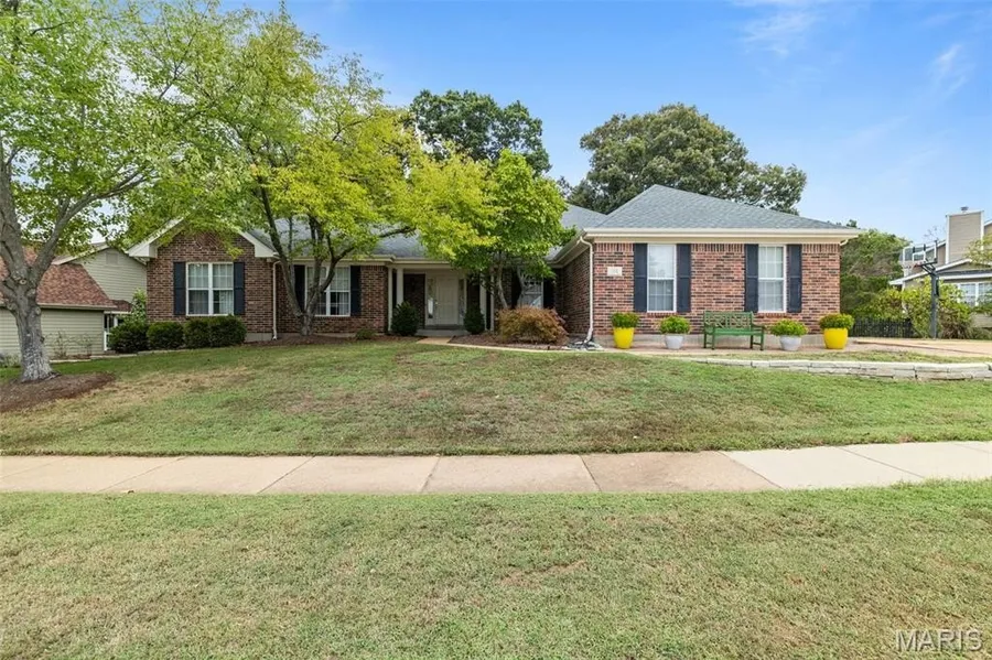 Enjoy luxurious living in this Ballwin atrium brick ranch! You'll love the curb appeal, with beautiful landscaping leading to the covered porch, plus side-entry 3-car garage. Thoughtfully designed floor plan is perfect for entertaining. Foyer opens to the bright living room with vaulted ceilings and stunning stone floor-to-ceiling gas fireplace. Off the living room is the open dining room, featuring large windows over looking the backyard. Gorgeous kitchen features new countertops and tile backsplash added in 2024, butcher-block island, stainless appliances updated in 2020, and a breakfast nook with coffee bar, and large pantry. Enjoy the cool fall weather on the covered deck just off the breakfast room. Primary bedroom features an en-suite bath with a freestanding tub, step-in shower, and beautiful stained glass window. Two more spacious bedrooms, full bath, half bath, plus a large laundry room with counter and cabinet space complete the main level. You'll love the open staircase leading down to the finished lower level with new flooring. You'll have a large family room with gas fireplace, office with built-in bookshelves, bedroom, full bathroom, plus storage. Walk-out to the multi-level patio and fenced backyard perfect for entertaining, with beautiful trees to act as a backdrop and add privacy. Located in a wonderful neighborhood community, with quick access to Castlewood State Park, this home has everything on your list and more! Updates include: New HVAC and water heater in 2019, new vinyl siding in 2023, and new roof and skylights in 2024.