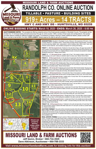 AUCTIONEER'S NOTE: These great parcels offer some of the best in Randolph Co. The property will be divided into 14 tracts and sold at online only auction. This diverse offering includes tracts of various shapes and sizes to accommodate a range of budgets. For more information or to view the property, please call or text Jeff Quinn at 660-734-3925.