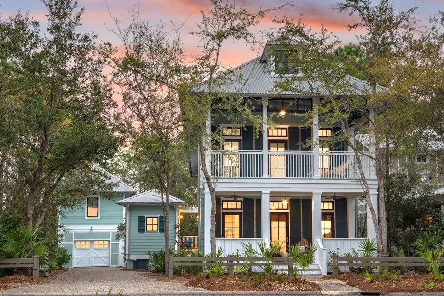 Recently renovated to the highest standards, this Southern-style home has shady, covered porches on both levels. Backing on to preserve land with mature pine trees, it enjoys a sense of privacy yet is just two blocks from Camp WaterColor fun. The open-concept living space has dark wood effect flooring countering the high ceilings, white decor and transom windows delivering an abundance of natural light. The chef’s kitchen has been beautifully updated with a full range of stainless appliances and a built-in beverage bar. Quartz countertops extend over the generous island which easily accommodates five diners at the breakfast bar and overlook the cozy fireplace providing a focal point in the sitting area. Dine at the formal dining table or outdoors on the deep screened porch. It boasts a pleasant outlook onto permanent green space with steps leading down to the rear yard and neighboring carriage house. Five bedrooms, all ensuite, include a bunk room and a spacious master suite with twin vanities, a free standing garden tub and tranquil tree-top views. The second-floor balcony even has a swing for lazing away the days with a good book or snoozing after lunch. The independent carriage house includes a tastefully appointed sitting room with shiplap walls, a fully equipped kitchen and a bedroom and bath above the two--car garage. It even has a deck for guests to enjoy their own outdoor space, relaxing in the breeze. Within easy reach of WaterColor pools, parks, trails and amenities, this turnkey home is ideal for investment in this sought-after location. Fully furnished, recently updated and immaculately presented, it has a proven history for vacation rentals, generating more than $239,000 annually.
