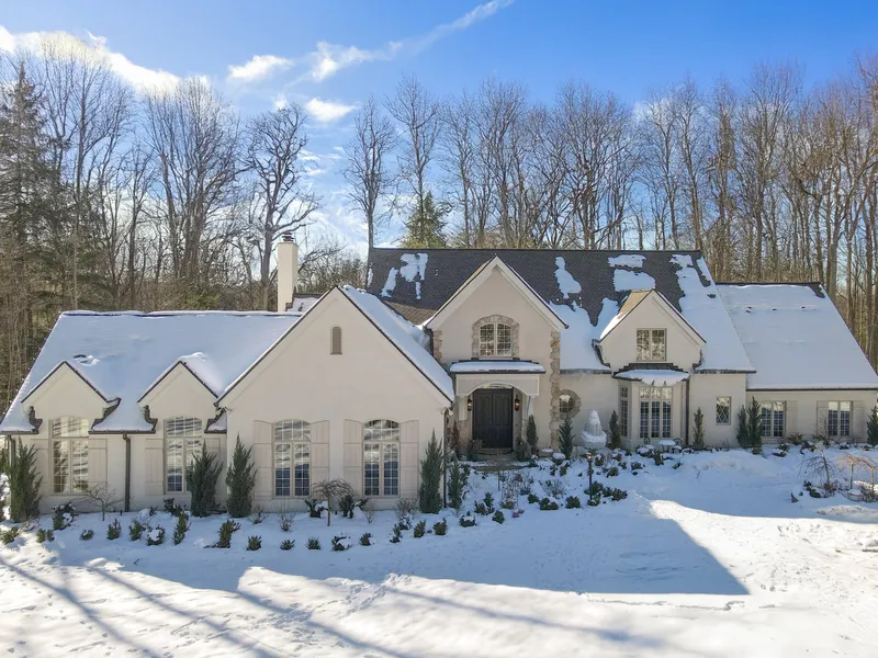 Nestled on 2.5 acres of serene beauty, this European-inspired manor blends classical elegance with modern comforts. A grand covered entry and winding bluestone pathway lead to an awe-inspiring octagonal foyer with limestone floors and soaring 20-foot ceilings. Inside, gleaming hardwood floors, intricate crown moldings, and wainscoting define the refined interiors. The great room boasts a dramatic vaulted ceiling, wood-burning fireplace, and expansive windows framing picturesque views, while French doors open to a terrace ideal for grand entertaining. The open layout kitchen flows seamlessly, featuring top-tier stainless steel appliances, custom cabinetry, and granite countertops. A cozy dining area overlooks the verdant landscape, complementing the formal dining room, perfect for lavish gatherings. The primary suite is a first floor retreat with high ceilings, en-suite bath with dual vanities, and a Palladian window showcasing breathtaking views. Two expansive walk-in closets, including a cedar-lined space, elevate the suite's indulgence. A stately library with custom cabinetry provides an elegant home office or reading nook. Upstairs, a loft retreat leads to three generously sized bedrooms, each with walk-in closets and premium finishes. The lower level is designed for relaxation and entertainment, featuring a second fireplace, oversized windows, and access to a bluestone patio with sweeping views of the Chagrin Valley. A meticulously designed 3-bay garage, whole-house generator, and elegant circular driveway complete this extraordinary estate. Thoughtfully restored with a neutral palette, this home harmonizes luxury, functionality, and timeless sophistication.