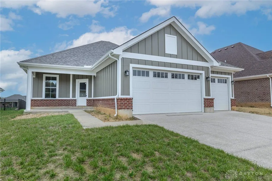 Brilliant design in Xenia's popular Wright Cycle Estates neighborhood! There's no wasted space in this beautiful brick and Hardie ranch featuring a full three-car garage! From the covered front porch, the angled entry provides privacy from the street. Inside, enjoy the front-to-back WIDE OPEN living space with stone-wrapped, oversized corner gas fireplace. The kitchen features beautiful, high-end white cabinetry with soft-close doors and drawers and pantry closet. Don't miss the stainless appliance package featuring a gas range! The dinette area is light and bright thanks to an oversized fixed-pane window and glass patio door. The Primary bedroom is nicely sized and complimented by an ensuite bath; including a double-basin vanity, custom tile and glass (to be installed) shower, private commode room and generous walk-in closet! Split from the Primary, the other side of the home includes two generously sized guestrooms with laundry room between as well as a full bath. Relax away your evenings on the 17x10 covered rear patio with northern exposure. The extra-deep lot provides nice separation from the homes to the rear. Additional amenities include: Four-sides brick ~ Premium garage doors ~ Hardie trim ~ Full-width driveway ~ 95% efficient gas furnace ~ Mission-style trim package ~ Deep tub ~ Fully sodden yard. This home is NEARLY COMPLETE and ready for you!!