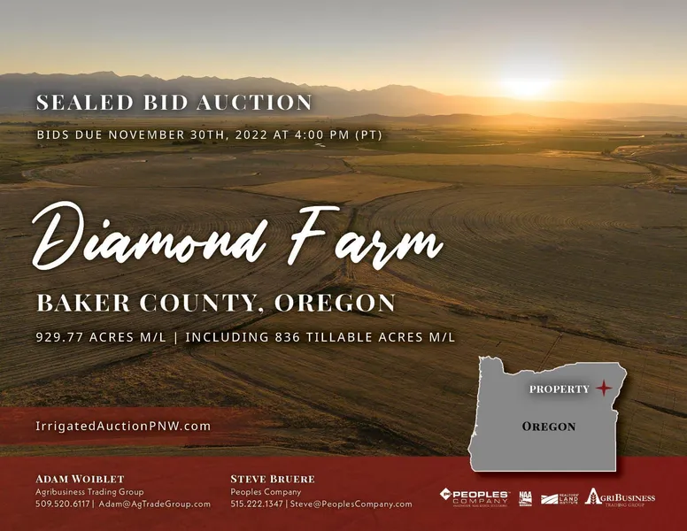SEALED BIDS DUE NOVEMBER 30th! Located in the picturesque Baker Valley, this irrigated farm asset is comprised of 929.77 +/- deeded acres near Baker City, Oregon. Baker City was the first town to be established along the Oregon Trail in the northeastern portion of the state. Due to ample water and rich soils throughout the region, this area is known to produce a wide variety of crops including grass seed, alfalfa, wheat, and some vegetables, including potatoes.