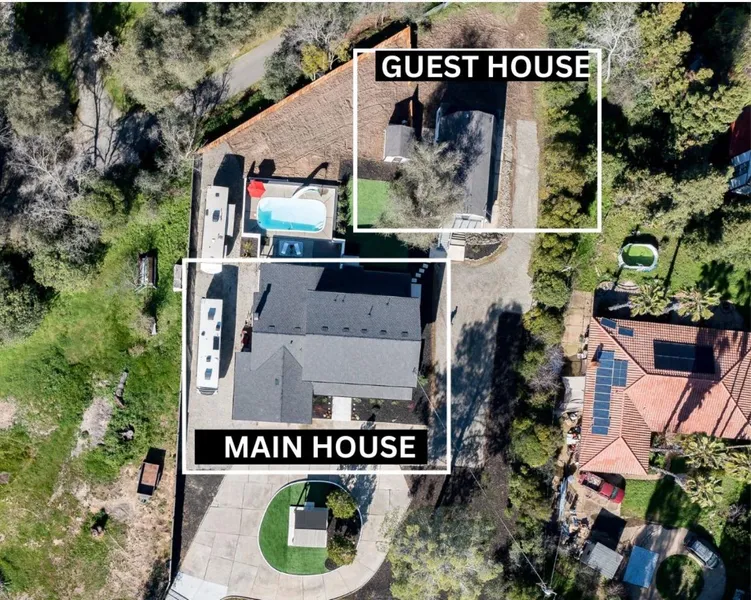 2 HOUSES ON 1 FULL ACRE LOT! This park like residence includes a MAIN HOUSE and a large DETACHED ADU GUESTHOUSE, nestled right across from Folsom Lake centrally located in the desirable community of Granite Bay. Home offers a unique opportunity for multi-generational living or rental income options with plenty of room to expand! The main home and guest house are beautifully renovated with a combined approx. 4300 sq ft of living space. MAIN HOUSE is 4 bedrooms 3 full baths with nearly 2500 sq ft of living space, new roof, new flooring, new fixtures, new carpet, updated bathrooms, new paint inside and out and boasts a brand-new beautiful gourmet kitchen, sleek new cabinets, sparkling quartz countertops, stainless steel appliances with a custom downdraft range hood. The detached 3 Bed/2 Bath ADU guest house is separately metered and offers approx. 1800 sq ft of living space and retains the character and charm of its original barn structure, while offering a contemporary living space. Bring your toys, RVS and dreams! No HOAs or Mello Roos!