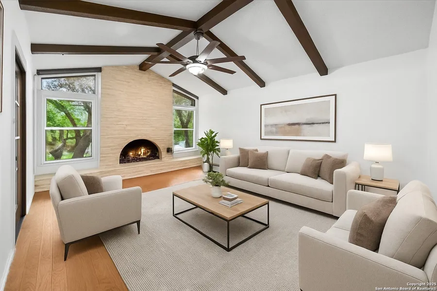 Discover the charm and space of 9330 Sumac Dr. in Garden Ridge Estates, a beautifully designed split-level home set on over three-quarters of an acre with mature trees and serene Hill Country surroundings. Offering more than 3,000 sq ft, this 4-bed, 3.5-bath property features three distinct living areas, including a front living/dining room and a main living room with a stunning floor-to-ceiling stone fireplace framed by expansive windows. The main level includes a bedroom and full bath, while the split-level upper floor hosts the primary suite with two walk-in closets and a private balcony overlooking the treetops, along with two secondary bedrooms and a double-vanity hall bath. The lower split level adds a spacious game room with a half bath, walk-in closet, and sliding doors leading to the backyard. Outdoor living shines with a large covered brick patio, extended brick seating areas, and an in-ground pool and hot tub perfect for enjoying Texas weather year-round. A circular driveway provides ample parking and a welcoming entrance for guests. Ideally located in Garden Ridge, this home offers the tranquility of Hill Country living with convenient access to major highways, shopping, and dining at The Forum.