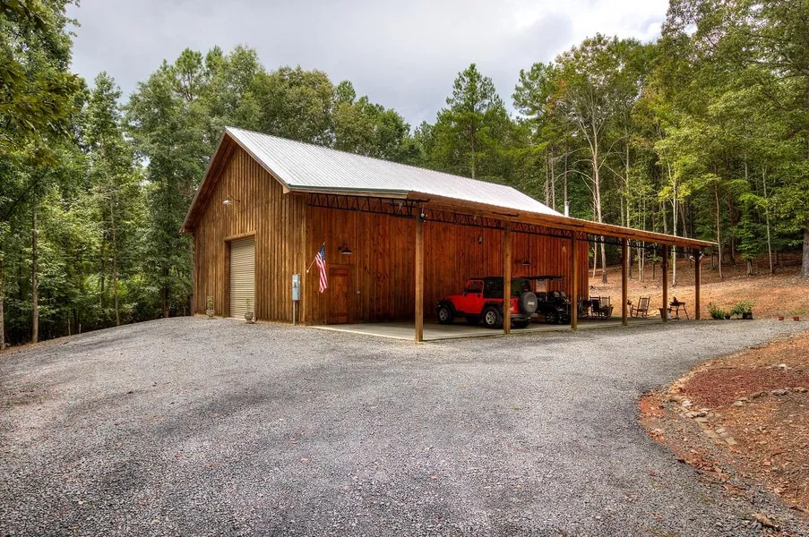 Privacy abounds on this 13.3 acre tract with a 3 Bedroom 2.5 Bath Barndominium home on site. Enter the property on a long and winding gravel drive to explore the wooded acreage that also leads to the gated entrance to the home. The home sits on a cleared knoll with large carport area large enough for 5 cars or use part of it as a covered patio area. The home features a modern up to date kitchen with breakfast bar, stainless appliances, tons of storage and tile backsplash along with a wood burning stove with a stone hearth. The Master Bedroom is also located on the main level with Master Bath. Upstairs you will find a Family Loft area for watching TV and relaxing as well as 2 additional bedrooms and baths and rear stairs. At the rear of the home is a separate garage and shop area perfect for storage, Big Boy Toys, and more. The acreage offers abundant wildlife or several other homesites. You will not be disappointed with this property. 2019 Property Taxes are $93. No Sunday showings.