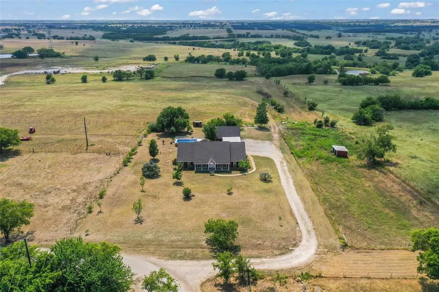 This beautiful, traditional brick home on 5 acres offers scenic views and is located outside the city limits. The 3 bedroom, 3 bath home (3rd bath in garage) has been updated with wood-look tile floors, new interior paint and carpet. The kitchen features granite counters, oversized sink and industrial faucet, with an adjoining dining area. Large utility with 2nd sink, counter & cabinets. A bright, sunlit office connects to the master bedroom suite, which includes a walk-in closet. Ensuite master bath has a garden tub and separate shower. Home has spacious covered front and back porches. Above ground pool is fully refurbished and ready for the hot, Texas summers! The adjoining carport holds 3 cars and is tall enough for most horse & utility trailers. The separate 2 car garage has a bathroom, an upstairs living area and a plug in for an RV. (3rd bath in garage is currently not connected to aerobic septic and needs updates.)Owner has new survey; use Mel at Designated Title.