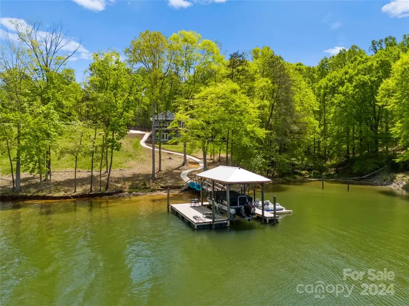 Live the lake life in this custom waterfront home! Built in 2021 on 1.97 acres, it offers panoramic lake views and over 219 feet of shoreline. Enjoy the covered dock with a 7000lb lift for easy boating. Inside, the family room flows into the stunning kitchen with a large island, custom cabinets, SS Bosch appliances, quartz countertops and double ovens. The main-level primary suite features its own private deck and luxurious bath. Another bedroom on the main level and two laundry rooms add convenience. Downstairs, find more space with a family room, two bedrooms, a full bath, and a flex room. Plus, custom shelving in all closets. Just minutes from the new Villages of Sherrills Ford, this home is perfect for lake lovers!