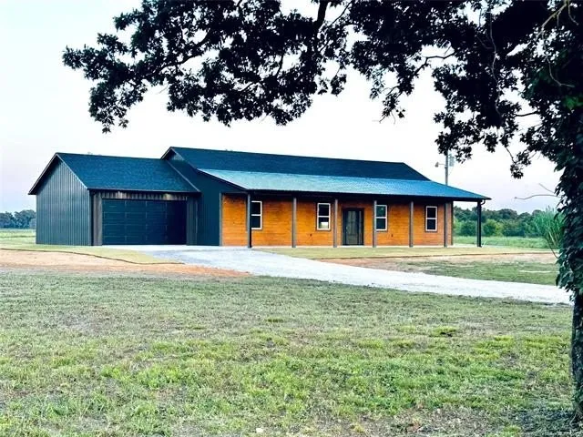 Stunning new construction sits on 5 acres and offers breathtaking sunset views from the covered front porch. The home features 3 bedrooms and 2 bathrooms, with an open and spacious layout, wood-beamed ceiling, and luxury vinyl flooring throughout the main living areas. In the kitchen, you'll find beautiful quartz countertops, under-cabinet lighting, stainless steel appliances, and a farmhouse sink that overlooks peaceful rural views. The oversized island provides additional storage, cooking space, and seating. All bedrooms feature carpeted flooring and include walk-in closets. The master suite includes separate his and her closets, and a stunning walk-in shower. Additional features include an attached two-car garage and exterior soffit lighting for enhanced security. It offers total electric utility service and access to Bragg's city water. The property is located approximately 2 miles from the Arkansas River, with boat ramp access, as well as proximity to Greenleaf State Park.