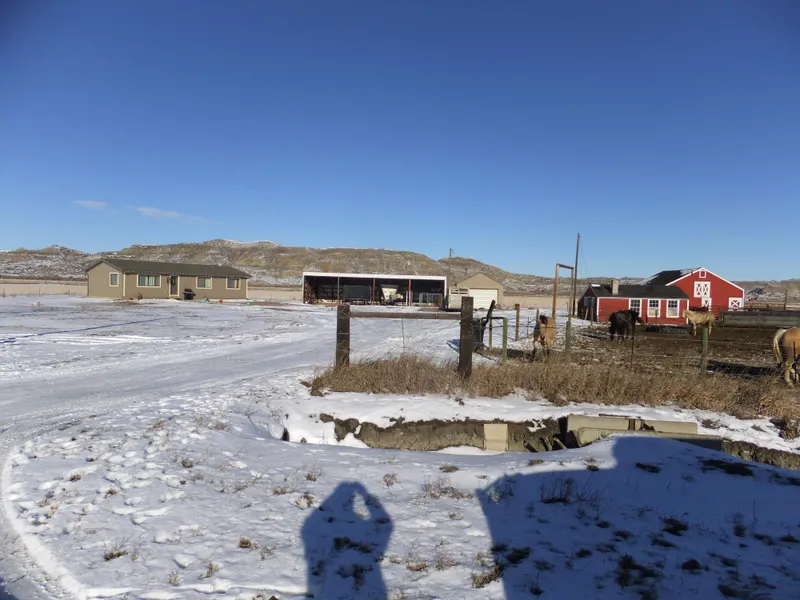 Tract 1B. 4.13 acres of which 1.5 is flood irrigated. A new Modular house set on crawlspace in 2014. House is in good condition and move in ready. Property has a barn, garage, open face shed and small shed. Pipe corrals for horses or cattle.