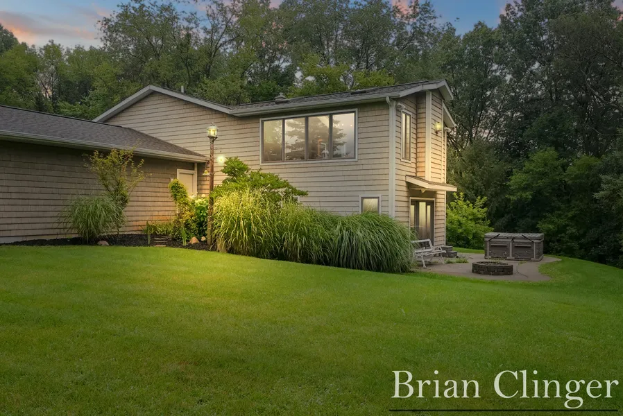 Beautiful home with 2 master suites on ten acres with a heated pole barn. The kitchen and great room are stunning overlooking the private wooded views. The lower level master suite opens to the patio with fire pit and hot tub. It also has a very generous walk in closet. This home also has high end solar panels system for those who might enjoy a $12 a month electric bill. This is a unique home and a must see.
