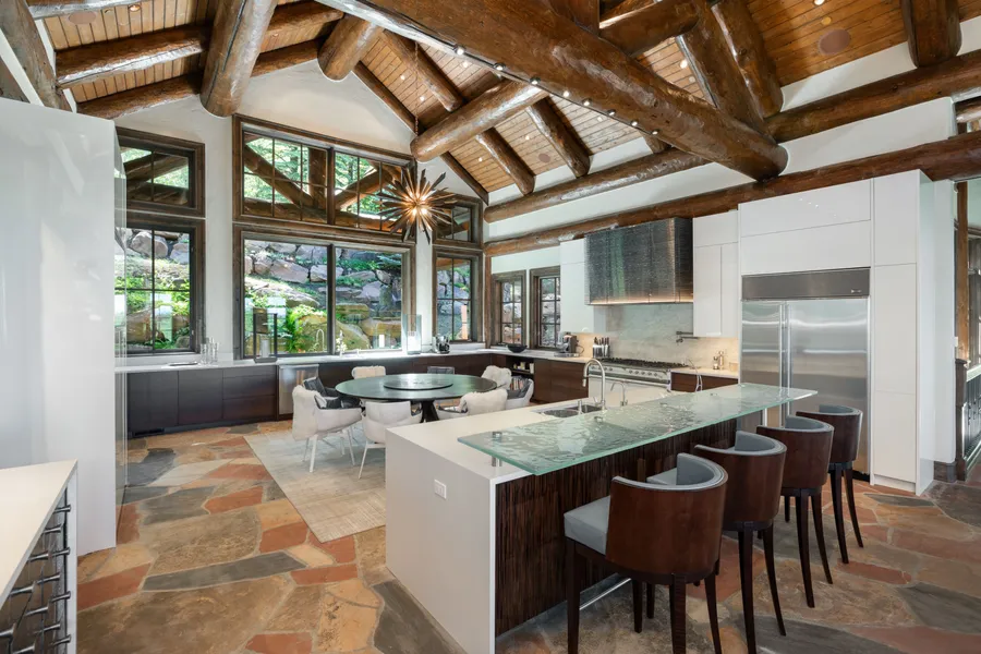 This ski in ski out property is a quintessential Bachelor Gulch home modeled after the lodges in the National Parks with a combination of lodgepole pines, moss rock, grand trusses, along with the stone waterfall as a centerpiece.