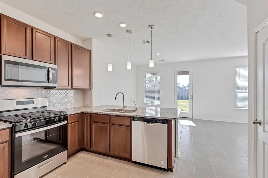 Discover this charming 3-bedroom, 2.5-bathroom two-story home, Perfect Condition; NEVER-LIVED-IN HOME. ideally situated near Hwy 249 for effortless commuting and convenient access to shopping, dining, and entertainment. The open living and dining floorplan creates a welcoming atmosphere, perfect for entertaining family and friends. The modern kitchen is a chef's dream, boasting granite countertops, a breakfast bar, stainless steel appliances, a walk-in pantry, and a gas range. Upstairs, you'll find all three bedrooms along with a versatile open space that can serve as a second living area or game room. The primary bedroom is a tranquil retreat featuring an ensuite bathroom with dual sinks, a tub-shower combo, and a walk-in closet. Step outside to your fully fenced backyard, complete with a covered patio, ideal for outdoor gatherings. This home perfectly blends comfort and style in a fantastic location-don't miss your chance to make it yours!