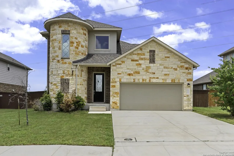 Welcome to 945 Foxbrook Way, a beautifully maintained 4-bedroom, 3-bathroom home offering modern comfort and serene backyard views in the desirable Foxbrook community. The spacious downstairs master suite features a luxurious bathroom with a walk-in shower, separate garden tub, dual vanities, and a large walk-in closet. A dedicated study down the hall from the grand entrance provides the perfect space for a home office. Upstairs, you'll find three generously sized bedrooms and a large game room flooded with natural light-ideal for family fun, entertainment, or relaxation. The heart of the home is the gourmet kitchen, complete with a gas stove, oversized island, custom cabinets, granite countertops, and a refrigerator that conveys with the property. Additional highlights include a laundry room with ample cabinet storage, a sprinkler system, an owned alarm system, a 2-car garage, and a covered patio perfect for barbecues and outdoor gatherings. Best of all, this home backs directly to a peaceful greenbelt with no rear neighbors, offering ultimate privacy and a tranquil natural backdrop. Located in the highly regarded Schertz-Cibolo-Universal City ISD, with easy access to community amenities like a pool, playground, and trails. Don't miss this exceptional property!