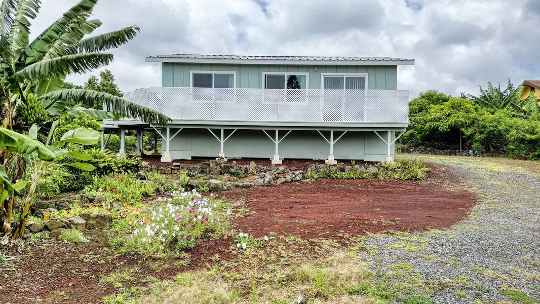 Live off the grid in style! This charming 1 bedroom, 1 off-grid home in Naalehu sits on a sprawling 21,059 sq. ft. lot surrounded by lush trees for ultimate privacy. Enjoy peekaboo ocean views and stunning vistas of the Waiohinu Hills. This home is perfect for those seeking an escape from the hustle and bustle of city life. With solar power and county water, you can live comfortably, while still enjoying all the modern conveniences.