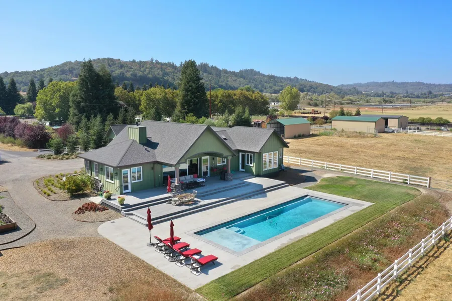 Step into country luxury on this sprawling 11.67 acre estate nestled in Alexander Valley. The custom farmhouse offers 2,928 square feet of single level living space. The meeting point of rustic sophistication, the interior of the home offers luxury finishes throughout, with a well-equipped chef's kitchen and exposed beam ceilings in the living room and master suite. Enjoy the ease of indoor/outdoor living with 22' sliding doors that retract completely into the living room wall. An impressive outdoor living area with a pool and deck overlooks the valley floor and provides a stunning view year-round. The property is dotted by charming sheds, barns and structures that let your imagination soar. A 2 bedroom, 1 bath, 1,200 square foot guest house/studio and a 600 square foot caretaker's quarters with full kitchen, central heat and air, with washer/dryer allows for extra room for guests or tenants. Expand your equestrian interests with the 3 covered stalls with separate tack and feed rooms, and a 240X135' riding arena. Adding to the natural splendor of the property are gardens and an existing pond that serves as a bird refuge. Solar panels that make for nearly nonexistent electrical costs are an added bonus. Gated privacy and ample parking throughout for 15+ vehicles and toys among attached, detached, and covered parking spaces round out this property. Conveniently located only 3.7 miles to Healdsburg Plaza.