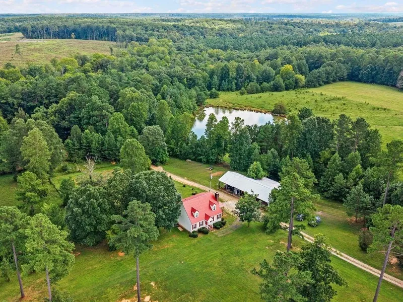 Nearly 100 acres divided into three parcels being sold together (50.05, 22.59, and 22.59 acres) offering flexibility for residential use, farming, or hunting. Move the animals & your whole family here! Previously a fully functioning cattle farm, the land is ready to support your farm operation or country lifestyle. A beautifully maintained Cape Cod showcases a timeless farmhouse aesthetic with white vinyl siding, a striking red metal roof, and a welcoming country porch overlooking the pond. Inside, find two full suites—one on each level—each with an attached bath. The upstairs also includes a wet bar and living area that can be converted into an additional bedroom. Two living spaces on the main level, a laundry room with cabinetry and sink, and thoughtful storage make the home both charming and practical. The property includes an expansive 13-bay detached carport and garage with storage. A separate utility building with water and electricity provides additional functionality. Two frost-proof hydrants and open pastureland make it well-suited for livestock. A brand-new HVAC system was installed in 2024. The large front porch is ideal for lounging. Fiber optic internet!