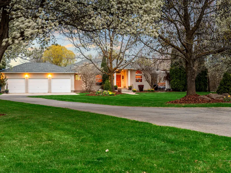 Own one of Eagle, Idaho's best kept secrets.....a serene country estate with sprawling green pastures, distant mountain views and 2 short miles to the Boise River Greenbelt and downtown Eagle. Nestled on a quiet cul de sac, this gorgeous ~5 acre oasis has water rights dating back to 1898. There's plenty of room for a barn, horse arena and cattle runs. The single level residence with an unfinished walk out basement features a bright open kitchen, gleaming oak hard wood floors, and a finished 3 car garage. Enjoy gorgeous 360 degree views from the main level or from the expansive back deck. The daylight basement is already framed for three large bedrooms (included in the bedroom count), a full bath (framed and plumbed would be bath #3) and rec room. The lower level just needs sheetrock, flooring and a finish carpenter to add instant equity and double the finished sf. The southern field is planted in organic grass/alfalfa hay and typically yields four cuttings a year. This rare find has endless possibilities!