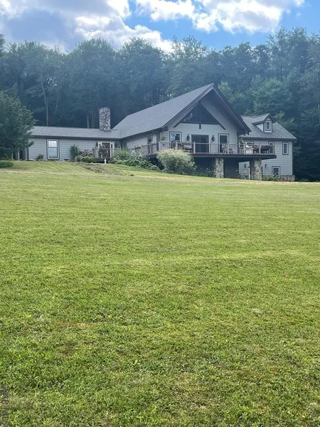 Picture perfect country paradise can be found from the front deck of this sprawling A-frame with a large addition. This 25 acre property has a large stocked pond, plenty of trees and foliage and boarders state game lands! The addition of a 1,400 square foot newly built pole barn is the perfect place to utilize however you want . Inside features an open concept living area with beamed ceilings, a fireplace, large center island and cherry cabinets. sliding doors to the large front deck overlooking the pond. Two master suites with updated bathrooms, two additional bedrooms with a jack and jill bath. Lower level has a family room with fireplace, bar area and a large office space. Truly a one of a kind property .