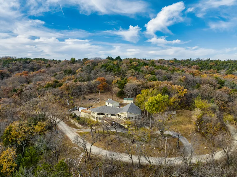Stunning, one-of-a-kind lake home! This beautiful property is surrounded by 6+ wooded acres with incredible lake views. Enjoy watching the turkey, deer and eagles from either of the two large decks at this Kansas paradise. This home features 8 BRs, 4 BA, with tons of space for entertaining! The main level features an open concept living room, kitchen, and breakfast area with large windows and beautiful cathedral ceilings. Formal dining room features a custom built 14 ft. dining table and buffet. Primary suite is on the main level w/ private bath and large walk-in closet. Walk directly out from the primary suite on to the deck to enjoy more stunning views. Upper level loft perfect for an office space. Lower level walk out bsmt boasts a large family room with wood burning stove, rec room, 3 BRs and BA. Tons of extra storage! Another large patio for entertaining in the back, plus 3 car garage, two large storage sheds and generator shed. MUST SEE HOME just a short drive from town!