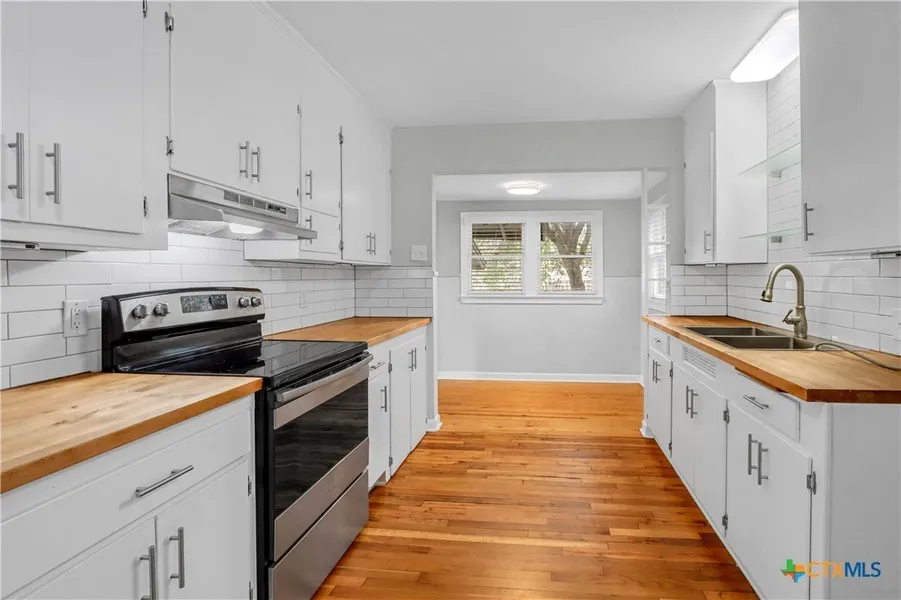 Conveniently located near downtown Seguin, retail, restaurants, and medical. This circa 1940s 3 bedroom 2 bath home features gorgeous original wood floors with some modern updates. Kitchen features butcher block counters, subway tile backsplash, and a cozy breakfast/dining area. This .24 acre lot includes mature shade trees, two storage units, carport, and additional alley access. Owner's suite has direct access to the back deck and expansive yard.