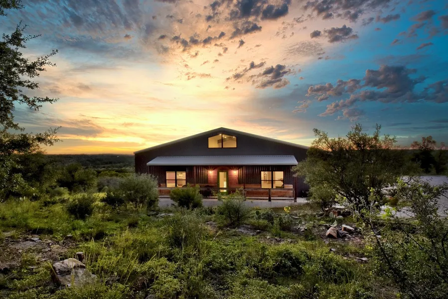 OFF GRID & SHORT TERM RENTAL OPPORTUNITY WITH STELLAR VIEWS! 10 Acre Hill Country Compound comprised of (2000+/- sf) main house and (700+/- sf) Guest Casita and Workshop, Ag Exempt! Mesmerizing Hill Country sunsets and Pedernales River access from this tranquil ranchette just 40 minutes from Austin. Rarely available newer construction, the homestead features streamlined, contemporary living quarters with a flexible floorplan under vaulted, exposed structural steel that can be configured to add to 2 more bedrooms if desired. Tranquil primary suite offers gorgeous natural light and 2 walk in closets. Extraordinary outdoor living overlooking the Pedernales River Valley accented by a screened in porch, rocked campfire area and outdoor shower. Whole house generator installed! Guest Studio and Workshop comes complete with a kitchenette and full bath attached to a foam insulated garage with roll up doors. Varied topography invites sweeping long range views over the Pedernales River Valley, stunning rock outcroppings, and level park like bottom land boasting live oaks and cedar elms. Enchanting trails have been carved throughout the acreage where one may come across white tail deer, red tail hawks, and a family of gray foxes. Dark night skies surround and pleasant sounds of nature abound. Water supply is harvested from purified rainwater catchment. Ownership is paired with private access to an exclusive 16+/- acre Pedernales River Park, ideal for picnics, kayaking, swimming, and fishing. Perimeter fenced. High speed internet in place. Reasonable restrictions, hunting permitted, Part-time short-term rentals allowed. Less than 10 minutes to restaurants, shopping, and wineries.