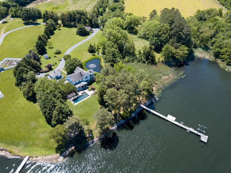 Totally turn key and sold furnished! Fabulous Eastern Shore classic built in 1999 overlooking Porter's Creek located just outside St Michaels. An easy bike or boat ride to town from this gorgeous property which offers a charming 4BR/ 3 1/2 BA )main house plus a separate 2 car garage with an office and bath above. This very private elevated lot faces west (gorgeous sunsets), includes a pond with beautiful water fountain, dock with lifts, fully rip-rapped shoreline, waterside gunite salt pool with waterfall, extensive hardscape and landscaping, plus an additional large garage used for lawn equipment and boat storage. The interior offers great living spaces with water views from nearly every room and offers high ceilings throughout. . The chef's kitchen is open to the dining area with fireplace, has high end stainless appliances (gas range and new dishwasher), a large center island, great pantry and mudroom off of it. Enjoy a cup of coffee in the adjacent sunroom or screened porch which is steps away from the outdoor patio and beautiful pool. The living room has a wood burning fireplace , built-ins, and access to the enclosed porch with large windows, slate floor, gas fireplace, and cathedral ceiling. A wonderful office overlooking the pond gives privacy while working and can also be used as an extra bedroom with its full bath across the foyer. Upstairs there are 4 bedrooms with beautiful new high-end carpeting. The large primary bedroom has a cathedral ceiling, spectacular river and pool views, it's own sitting room (with electric fireplace) and outdoor waterside balcony. The gorgeous master bath has been completely redone with marble floors, counter tops, sumptuous soaking tub and separate large shower. The walk-in closet is also new, spacious, and well appointed with Chesapeake Closet organizers. The other 3 bedrooms ( two with water views) share a generous sized hall bath with double sinks and a tub/shower. On the lower level, there is a partially finished basement used as a recreation room , separate storage, half bath and additional kitchen/bar area . The crawlspace has been encapsulated as well. The finished room over the garage is great and can be used as an office/ bedroom/living area, plus has a full bath. Having a separate entrance makes it convenient too for guests. Other improvements include new hardwood floors in the living room (refinished elsewhere), generator, floating dock, new HVAC on the 2nd floor, outdoor shower, Atlantic Broadband high speed internet, and much more. All furnishings and furniture are included other than seller's art, personal items, and selected excluded items.