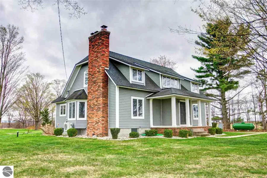 Magnolia farmhouse charm meets Restoration Hardware-chic in this beautifully updated home, set on 1.5 acres with a 40x60 pole barn, surrounded by rolling orchards and countryside between East Grand Traverse Bay and Elk Lake. The current owners started with the sturdy canvas of this Dutch colonial home with it's pleasing floor plan and flowing architectural spaces, and crafted a gorgeous piece of art through their updates - most every room was painted in a neutral-modern color palate, durable hardwood-style luxury vinyl plank flooring was installed throughout, lighting fixtures and kitchen/bath fixtures were replaced, and much more. Highlights include a relaxing haven of a primary suite complete with a dedicated sitting room, private fireplace and private bath, an L-shaped living room with a coffered ceiling, a 2nd fireplace, and plenty of space for entertaining, an island kitchen with granite counters and a beamed vaulted ceiling, a formal dining room with beautiful wainscotting and crown molding, and an opulent den with original hardwood floors and a floor-to-ceiling built-in bookcase. Low maintenance Hardi-plank siding adorns the exterior, a high-efficiency 8-zone boiler was installed in 2017, and the current owner installed two electric mini-splits for cooling. The back porch has removable screening and can be accessed by the kitchen and dining room, providing a lovely extension of the living space in warmer months. The 40x60 pole barn is new in the last couple years, complete with two overhead doors, electric, internet, and French drains in the concrete floor. This truly is a one-of-a-kind home!