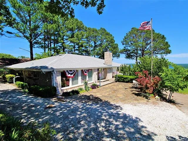 Lake Tenkiller year round view with this home featuring a custom made kitchen, covered deck overlooking the lake, wet bar with full kitchen, pantry, office, finished basement, large workshop, 2 car garage, storage & hobby room.