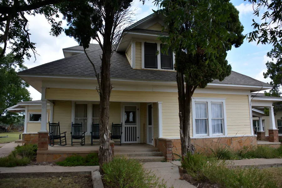 642 +/- acres with home, cabin and barns are located on north side of FM 218. The 2 story home is believed to be close to a century old and is a perfect combination of old and new. The integrity and unique features of the time period were left intact then modern conveniences and bonus room were added. Home has central heat and air along with a wood burning fireplace in great room. Downstairs the original hardwood floors were restored in living room, dining room, sitting area, kitchen and bedroom. The great room boasts stained concrete floors, fireplace, large windows, high ceiling with patio door leading out to covered porch. There are two bathrooms and a utility room downstairs also. Upstairs are 2 bedrooms with wide plank flooring and unique sitting area perfect for relaxing