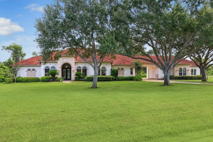 Striking Mediterranean-inspired 3 bedroom, 2.5 bath single story home on 1.794 acres backing to Oyster Creek. Elegant wrought iron door opens to formal living space where large windows provide views of the expansive back yard. Wood floors flow throughout living room, dedicated study with French doors and formal dining room. Family room with wood burning fireplace is open to gorgeous island kitchen and breakfast room. Kitchen features stainless steel appliances and butler's pantry in addition to a walk-in pantry. Primary suite has views of the back yard and private bath with massive closet. Secondary bedrooms share a Jack and Jill bath. Three car garage features an extra tall bay for boat or trailer parking and extra driveway for easier turn arounds. High ceilings give this home a very open feeling. Great architectural details such as crown molding and tray ceilings. Low tax rates, easy access to retail in Sugar Land & Pearland and about 25 miles to downtown Houston & the Med Center.