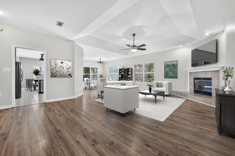 Short Sale. Call for details. Discover a remarkable property that blends modern comforts with community charm. Nestled in a gated community that promises tranquility and exclusivity, this home offers features that cater to various lifestyle needs. Whether you're relocating, a first-time homebuyer, or looking to downsize, this home embraces the outdoor lifestyle. With access to a community pool, nature trail perfect for running or walking, and a stocked lake ideal for fishing adventures The home itself boasts an updated infrastructure with a new HVAC system (2018), a roof installed in 2021, and a water heater from 2020, ensuring peace of mind. Inside, you'll find luxury vinyl plank (LVP) flooring throughout the living area and bedroom The fresh paint in the hallways and living areas sets a warm and welcoming tone. The living room provides a cozy atmosphere featuring a gas fireplace, coffered ceilings, and ample wall space for your decorations and electronics. The kitchen, accessible via both the dining area and living space, fosters an inclusive environment for family interactions and includes a charming breakfast nook for additional seating. The master suite stands out with coffered ceilings, a walk-in closet, and an ensuite bathroom with separate vanities, a shower, and a relaxing garden tub. Enhancing outdoor living, the fenced backyard and covered porch offer a private space for enjoyment and relaxation. Garage has plenty of storage with cabinets and a storage closet. Situated near bustling shopping areas and beautiful beaches, this community offers more than just a home; it provides a lifestyle enriched with convenience and leisure possibilities.
