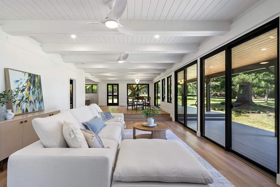 At the end of a country road, tucked behind a majestic Royal Poinciana tree, sits a true North Shore treasure. Originally designed by renowned Maui architect Harry Rice and now reborn as a mid-century modern retreat, the home is elegantly enveloped by more than four acres of lush, private gardens. Light-filled living spaces open to expansive lanais and a spa-like outdoor bath featuring a 72” concrete soaking tub and custom shower. The gourmet kitchen boasts a 48” Hestan gas range, paneled Hestan refrigerator, European-style cabinetry, and a dedicated pantry/prep area. The 3,100 sq. ft. home features 3 spacious bedrooms, each with a luxurious ensuite bath, plus a separate upgraded cottage ideal for guests. A custom eucalyptus spiral staircase and handcrafted details throughout accentuate the classic Maui roots. Mature fruit trees, peaceful walking paths, and a treehouse overlooking the forested gulch create a private, retreat-like setting. All the home's amenities and features, accompanied with North Shore conveniences, make this a truly unique architectural treasure. This is an A unit of a CPR.