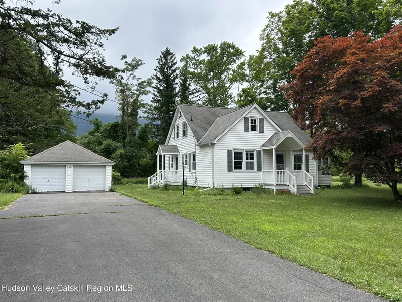This absolutely charming 3 bedroom 1 bath Cape Cod style home features mountain views, a sunny 3 season room off the light filled living room, gleaming hardwood floors on main level. Cozy brick fireplace in living room, curved door frames, dining room that faces the pretty view, cheery kitchen with lots of cabinetry and 1 year old refrigerator. Closets are plentiful throughout. Upstairs, a roomy 3rd bedroom with oil baseboard heat. A large loft area perfect for a den, office or many other uses (not heated). There is also more easy access storage area on upper level. Full basement with 1 year old washer, dryer, 5 year old oil tank, updated electric, Burnham oil burner. New submersible well pump. 2 car detached garage. About 15 minutes to the village of Woodstock, the village of Saugerties, close to hiking, skiing, and easy access to NYS Thruway.
