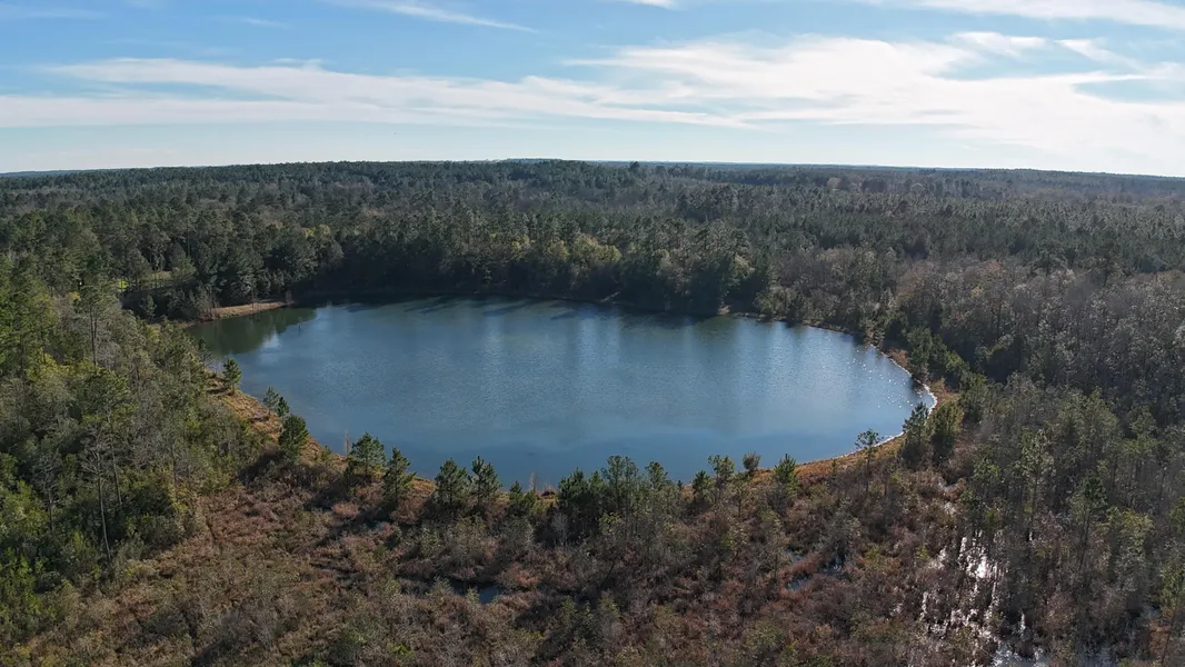 As you enter the property, you are greeted by mature longleaf pines that surround the homesite. The well-maintained trails allow access throughout the property and lead you down to the water's edge of the crystal-clear 6-acre lake and alongside the edge of Bilbo Creek. Fishing for bass and bream can be enjoyed from the banks surrounding the entire lake. This picturesque setting will offer you incredible sunrise and sunset opportunities to enjoy with family and friends, from the turkeys gobbling in the early spring mornings to the deer feeding in the fall on the lakeside food plot. Waterfowl also frequent this property, enjoying the flooded banks of Bilbo Creek. Two strategically placed food plots that consistently produce wildlife are ready to go for the upcoming season.