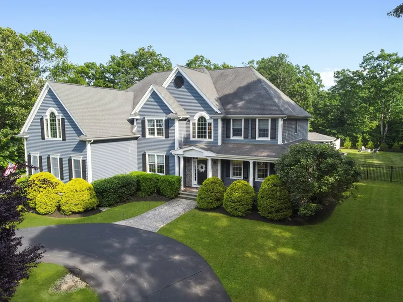 Enter through a private driveway on a lovely street, this house has everything and more all starting with 3+plus acres of privacy. When you enter the large sun-lit foyer you see that this house is made for entertaining. On the right, the living room and dining rooms are open with floor-to-ceiling windows. To the left, is a perfect home office and half bath. The kitchen and great room are open with cathedral ceilings. The windows overlook tree-lined acreage and an incredible yard. The wood-burning fireplace with a stone surround adds warmth to the space. Upstairs, the primary bedroom with ensuite, two walk-in closets, and a luxury bath is set privately from the rest of the bedrooms. An attached bonus room is currently a gym and would also be a great second office. Three additional large bedrooms, one with ensuite and two that share a jack-and-jill bath, and a laundry room complete second floor. The lower level is set up in Hard Rock Caf style with a speakeasy wine room, living area, bar, and humidor closet. The backyard of this home is paradise. The outdoor kitchen with stone pizza oven, heated saltwater pool, clubhouse cottage with living room, bathroom, wet bar, ice machine, and more! All of this is surrounded by incredible, classic design stone and patio work. The three-car garage is a bonus. This home is close to area beaches but with a yard like this, why go anywhere?