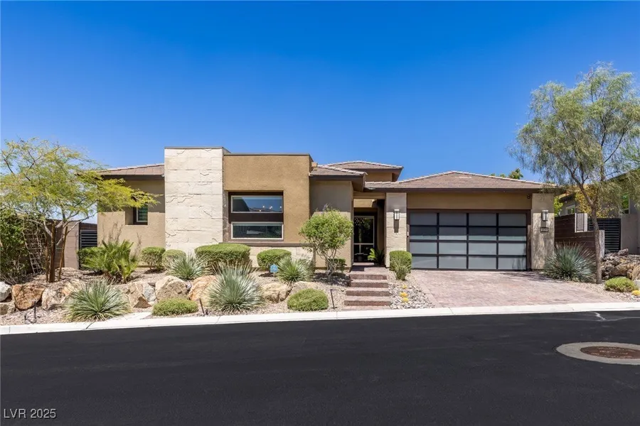 Experience luxury living in this exceptional single-story residence located in the prestigious gated community of Blackrock. Thoughtfully designed with high-end finishes throughout, this home features a gourmet kitchen with top-tier stainless steel appliances, built-in refrigerator/freezer, quartz countertops, a spacious island, breakfast bar, and walk-in pantry. The open-concept family room offers a floor-to-ceiling custom fireplace and corner sliding doors that enhance indoor/outdoor flow. The elegant primary suite includes direct backyard access, a spa-inspired bath with freestanding tub, oversized walk-in shower, and dual vanities. Additional highlights include a private office, separate game room, and formal living and dining rooms. The beautifully landscaped backyard boasts a heated pool with swim deck and sheer waterfall, covered patio, pergola, and view fencing overlooking a scenic bluff. Ideally situated near schools, parks, shopping, dining, and Green Valley Ranch Resort.