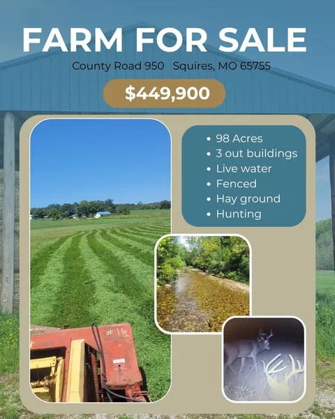 98+/- Acre Ozark County Farm - Little Creek & Near National Forest. Rare opportunity in Ozark County! This 98-acre farm, known as 'The Little Creek Hay Farm', features 3/4 mile of Little Creek, over 60 acres of productive hay ground, and approximately 25 acres of woods. Good fencing make it ideal for cattle, horses, or continued hay production. Three well-maintained outbuildings include a former Grade A dairy barn, a 48x48 framed hay barn with metal roof, and a large wooden hay barn with open sheds. Multiple building sites on unrestricted land provide endless possibilities for a home, farm expansion, or recreational use. Located less than 1/2 mile from Mark Twain National Forest access, this property offers privacy, scenic views, and low annual taxes ($73). Immediate possession available!