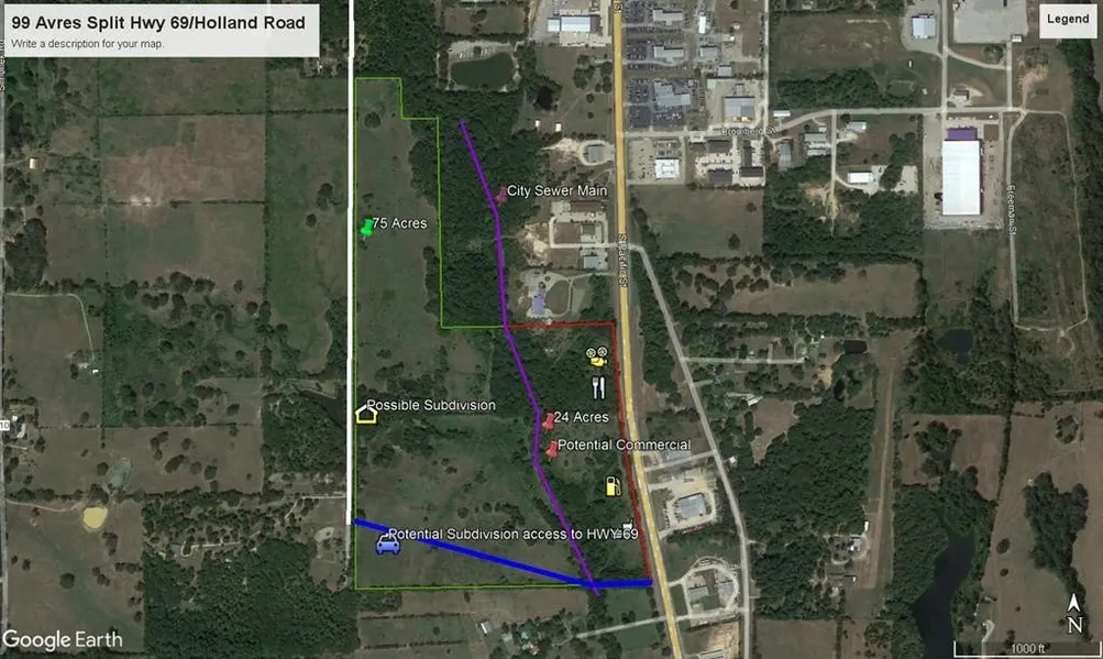 Great investment property ready to develop. The back 75 acres is ideal for residential development with 2,200 feet of road frontage on CR 2805 (Holland Rd) and 1,700 feet of road frontage on S Hwy 69, north of Loop 564 with easy access to Hwy 69. The front of the property is perfect for commercial development in a rapidly growing area.