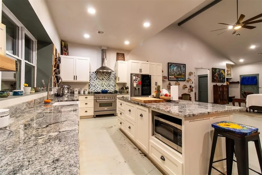 Inside, the split floor plan offers privacy and comfort. The gourmet kitchen boasts custom cabinetry, granite countertops, a farmhouse sink, high-end ZLINE gas range, and an oversized island with bar seating. A formal dining area makes hosting easy. The master suite features a spa-like bath with double vanities and a tiled step-in shower with bench seating. Both bathrooms feature tiled showers, and an interior safe room with reinforced door adds peace of mind.