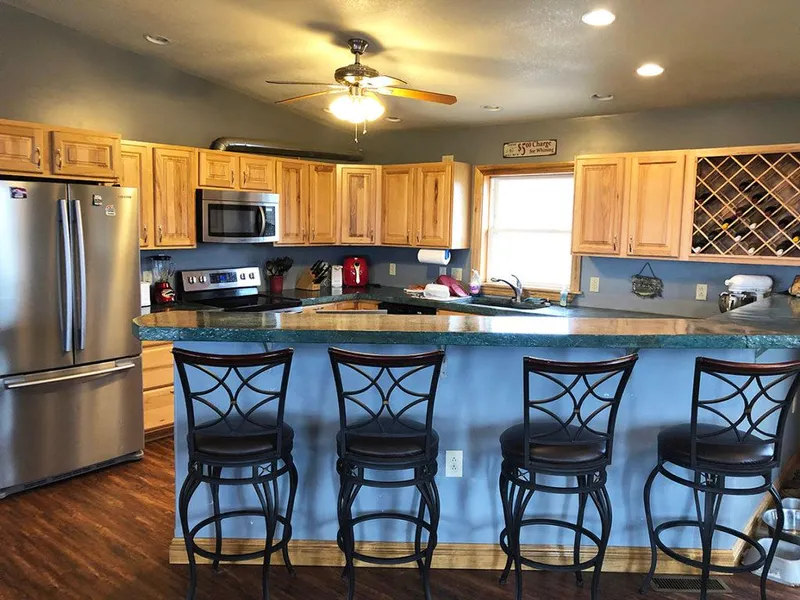 This home includes a spacious kitchen with beautiful Hickory Cabinets, lots of countertop space, large breakfast bar, and a wine rack. Several double hung vinyl windows throughout the house for lots of sunlight. The dining and living room is an open concept and includes a fireview wood stove. The double doors from the living room lead to a wrap-around deck to enjoy the views.