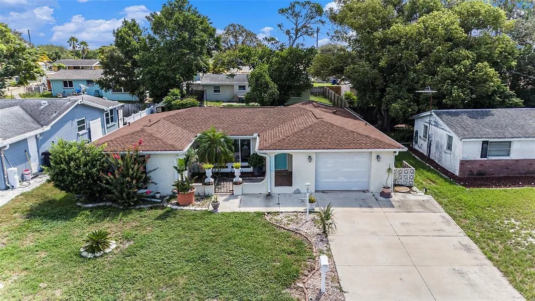 Charming 2 bedroom, 2 bathroom home offers a courtyard style patio- A spacious open living and kitchen with hurricane rated windows- A skylight that brightens the dining area. The primary bedroom features a walk in closet and attached bathroom. The bonus room is enclosed and perfect for a home office or a sitting room. Next to it you'll find a screened in patio. A fenced in backyard for added privacy. A new roof fully replaced April 2025