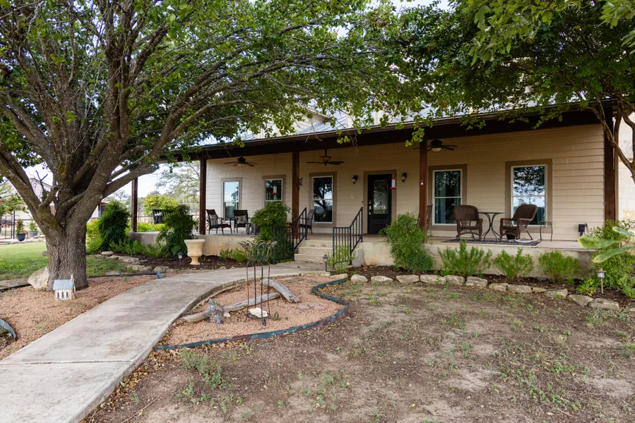 The ranch features a spacious 3,760 sq/ft house, with 4 bedrooms and 3 bathrooms. The house is designed with quality materials, including a standing seam roof, hardiplank siding, and a Sisterdale stone fireplace. The kitchen is outfitted with granite countertops, a large island, and ample storage space. The living areas include an office and a second-level game room with a balcony, offering additional flexibility for entertainment and work. A welcoming front porch overlooks a fenced and landscaped yard, shaded by mature trees.