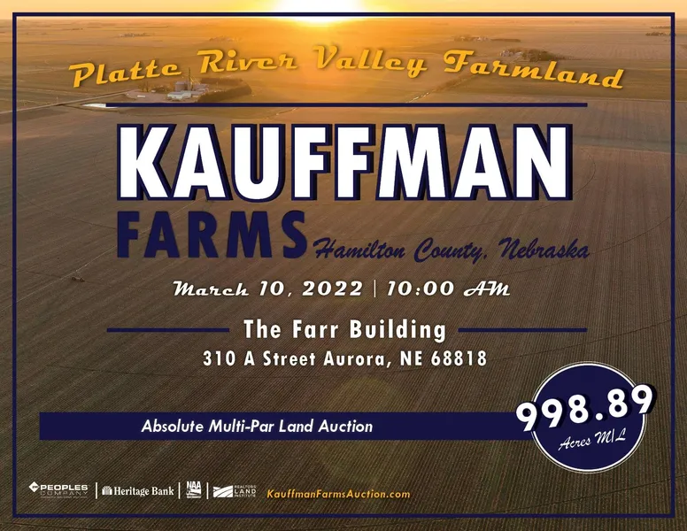 Offering a rare opportunity to own nearly 1,000 acres of prime Platte River Valley Farmland in Hamilton County, Nebraska! Over the years, multiple generations of the Kauffman family have worked to assemble a cluster of assets totaling 998.89 acres m/l. The property contains 972.58 FSA cropland acres m/l consisting primarily of the highly productive Class I soil, Hastings silt loam.