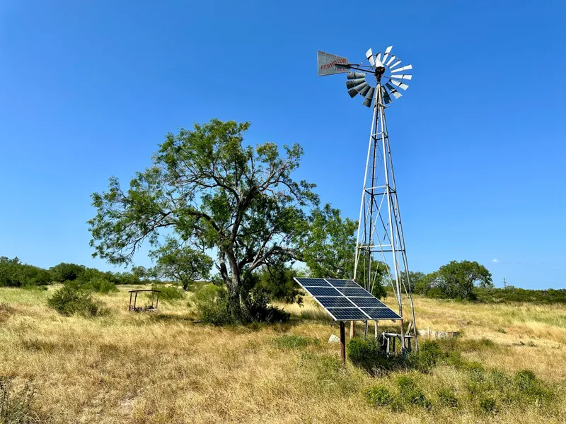 Water well (300 feet deep) with an RPS solar system and pump. Water well fills up the pond next to the windmill, which is soley for decoration. Good mix of South Texas native and improved grasses and brush typical for the area, with lovely mesquite trees.