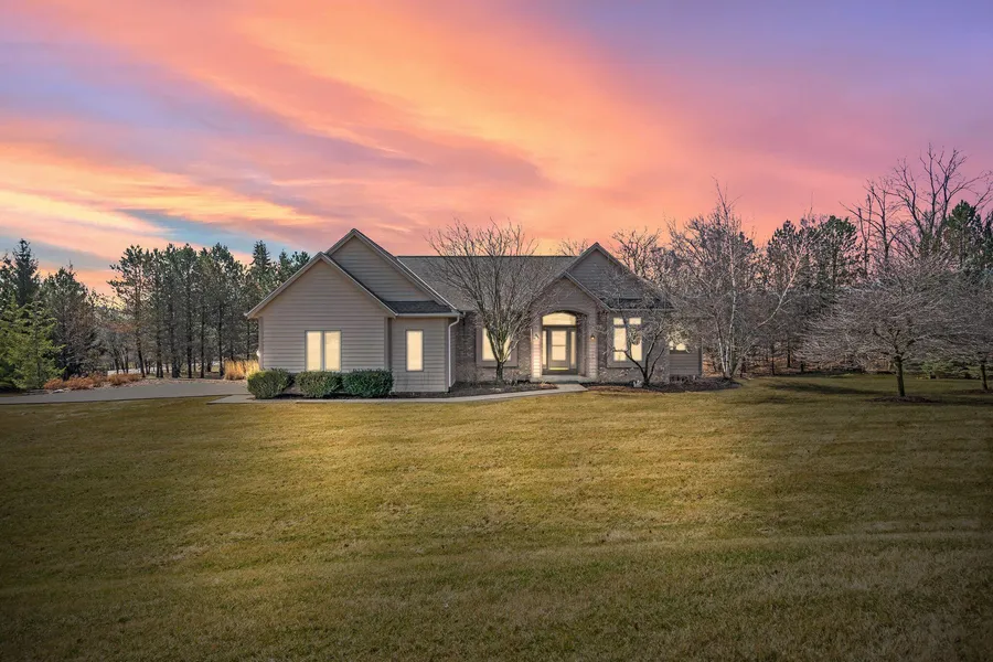 This custom-built 3 bed+den/2.5 bath ranch home, nestled on 1.88 +/- acres, is refreshingly inviting. Open concept, hardwood floors, and custom woodwork attests to the true craftmanship within. Master Bedroom with WIC, Jacuzzi tub and shower. A place to entertain, the walk out lower level awaits your ideas. (Currently studded and rough plumbed for another bath) Your home office sits just off the foyer, for when work follows you home. Sunsets off the deck and the abundance of wildlife truly turn this house into your forever home.New roof and gutters 2020. Photos taken by professional photographer; images may be enhanced. Measurements sourced from builder and have not been verified.