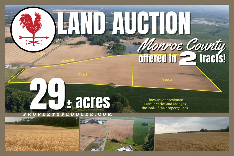 29+/- Acres tillable ground in Monroe County. WIll be offered in 2 tracts approximately 14.5+/- acres per tract. Located on Ahne Rd. Property has over 1,900 feet of road frontage. Fountain water is available at the property line. Property will be surveyed if sold in 2 tracts. Productive farm ground has a PI of 116. Possession will be at harvest of 2023 crops. If you are looking for a building site close to Waterloo, IL or adding to your farming portfolio check out this piece of land.