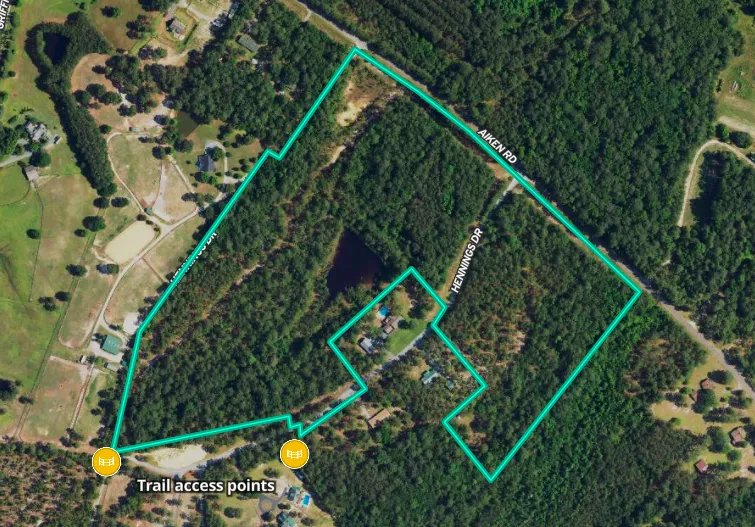 Equines welcome! Development or owner estate opportunity on +/-34 beautiful wooded acres in Moore County's idyllic horse country. Just minutes from world class golf and the charm of Southern Pines and Pinehurst. Highly coveted equestrian trail access to the 4,000-acre Walthour Moss Foundation and the Lakebay trail system adjacent to this property. Zoned Residential Equestrian (RE). Exact acreage and boundaries subject to final survey (in progress) and may not be reflected by the Moore Co GIS. Approx 32 AC currently in forestry land use with deferred taxes. Buyer can continue in program or pay for 3-yr tax rollback. Seller is offering an allowance for restoration of the onsite pond and dam. Contact listing agent for details. Extensive road frontage with +/-1,400 ft on Aiken Rd and +/-1,000 ft on Hennings Dr. A private Road Maintenance Agreement is in place for Hennings Dr. County water runs along both roads. Owner may consider selling the land on either side of Hennings Drive separately - the east side is approx. 11 Ac. The west side approx. 24 Ac.