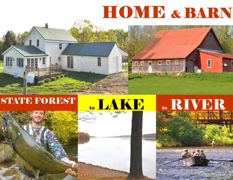 6.2 acres, big house, large barn, pond, out buildings, water wells, over 1000 water front on North Pine Meadow Brook, 450 paved road, utilities, walk to lakeside state forest, use huge lake and famous Salmon River through nearby State Land: $139,900.